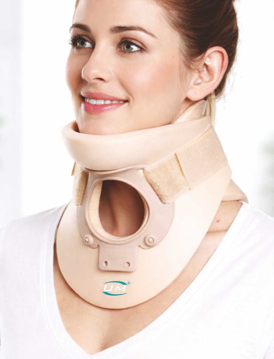 Constructed of two pieces of plastics. The height is adjustable, ethafoam edge padding improves cushioning, comfort and life of the collar ventilation holes for patient comfort and easy cleaning. Long hook-loop tape ensure snug fitting and easy application. Made from two overlapping polyethylene pecies, height adjustable using a velcro binding, padded on its upper and lower edges, lined with imitation leather, rear velco closure system.