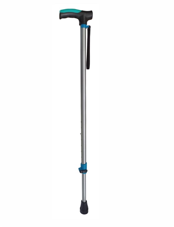 Made of high-quality anodized aluminium, with single leg design for better stability and helps those with poor balance. It has a push-button, length can be adjusted telescopically. Suction PVC bush foe abetter grip on any surface. It has plastic sleeves to reduce the friction between the upper and lower tubes.